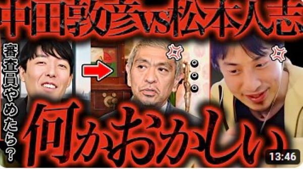 2023年5月29日に配信された中田敦彦さんが自信のYouTubeチャンネルで、「【松本人志氏への提言】審査員という権力」と題して、お笑いコンビ・ダウンタウンの松本人志さんに対して「お笑い賞レースの審査員をやり過ぎている」と批判。